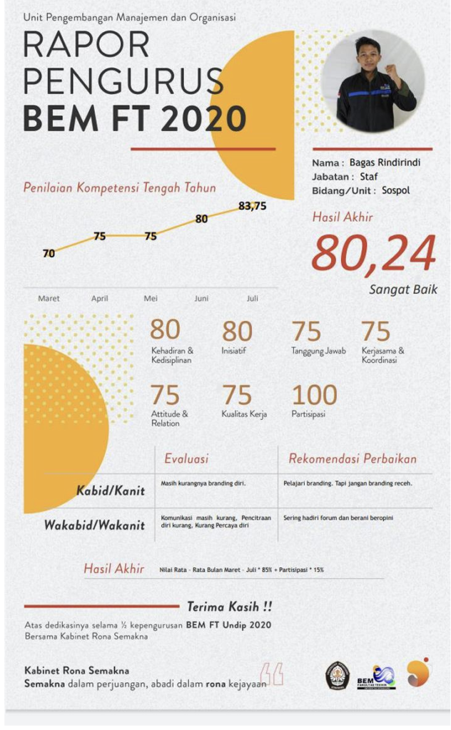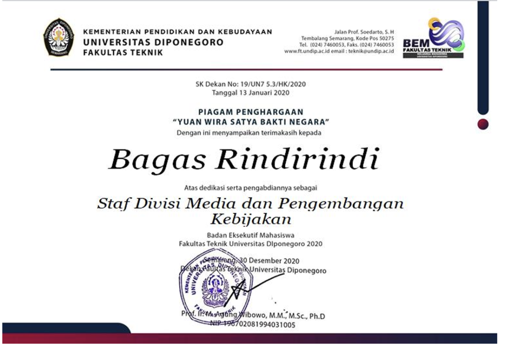 Selama masa menjabat menjadi staff Divisi Media dan Pengembangan Kebijakan Sospol BEM FT UNDIP saya pernah mendapat predikat staff of The Month pada periode Bulan November.